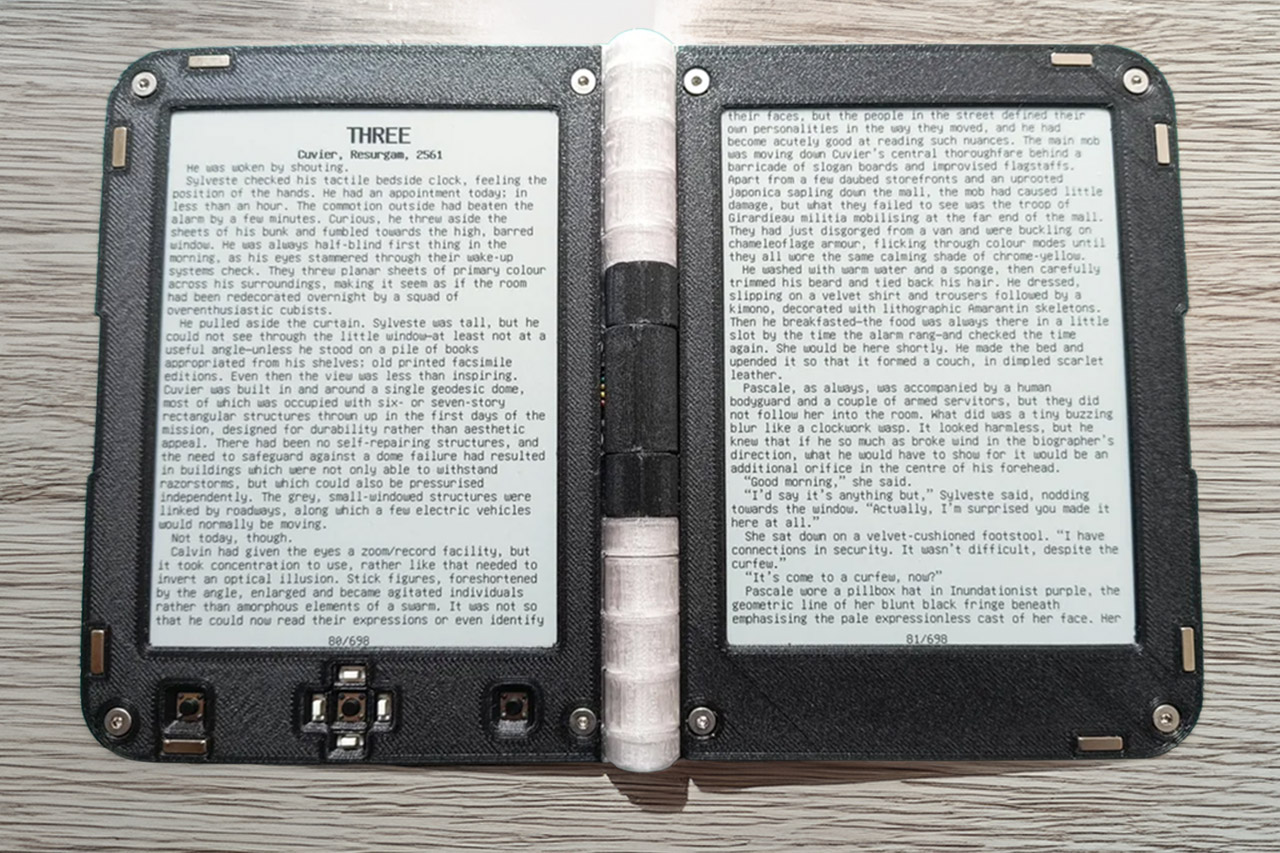 O resultado é um aparelho que se fecha como um volume de capa dura e, ao abrir, exibe duas páginas lado a lado, como se fossem as folhas de um romance impresso.