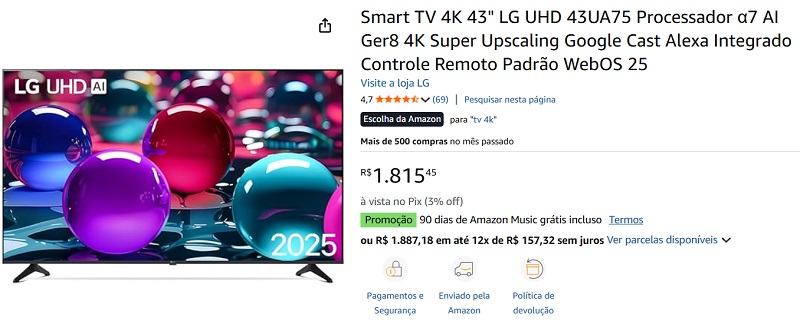 1. Smart TV LG 43″ UHD 43UA75 com Processador α7 AI Gen8
