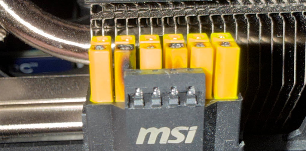 Durante a inspeção da placa danificada, descobriu-se que toda a fileira superior de contatos do conector 12V-2×6 havia derretido. A placa de vídeo funcionou por apenas 7 meses e estava conectada através do adaptador original MSI com conector amarelo a uma fonte de alimentação EVGA Supernova G+ de 1000W.