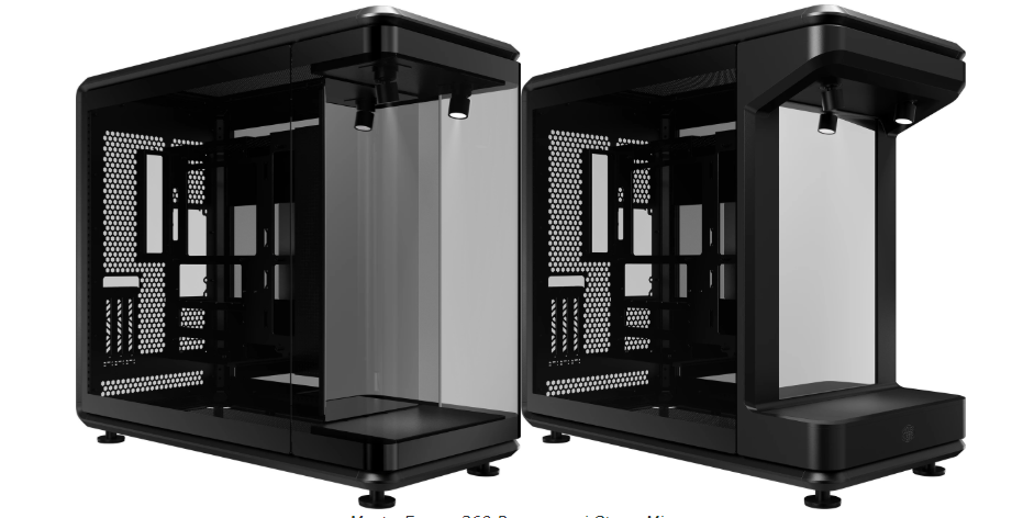 Já o MasterFrame 360 Stage Mirror adiciona painéis espelhados ao compartimento frontal, criando efeitos visuais multiplicados quando combinado com iluminação RGB. O recurso funciona como amplificador estético, refletindo luzes e componentes para um visual ainda mais impactante em ambientes com pouca luz.