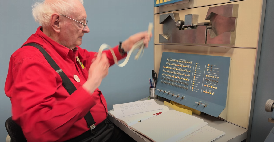 Peter Samson, engenheiro e docente do Computer History Museum, alimenta manualmente o PDP-1 com fitas de papel perfuradas contendo a versão codificada de “Olson”, faixa atmosférica do duo eletrônico Boards of Canada. O resultado final é fruto do projeto PDP-1.music, idealizado por Joe Lynch para traduzir a música curta e nostálgica em algo que o computador de seis décadas pudesse interpretar.