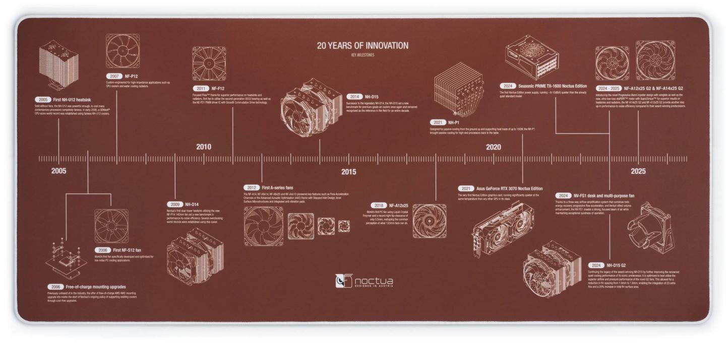 A fabricante austríaca Noctua está comemorando duas décadas de história no mercado de coolers. Para marcar a data, a empresa conhecida por seus ventiladores bege e marrom lança um mouse pad gigante que funciona como linha do tempo interativa da marca.
