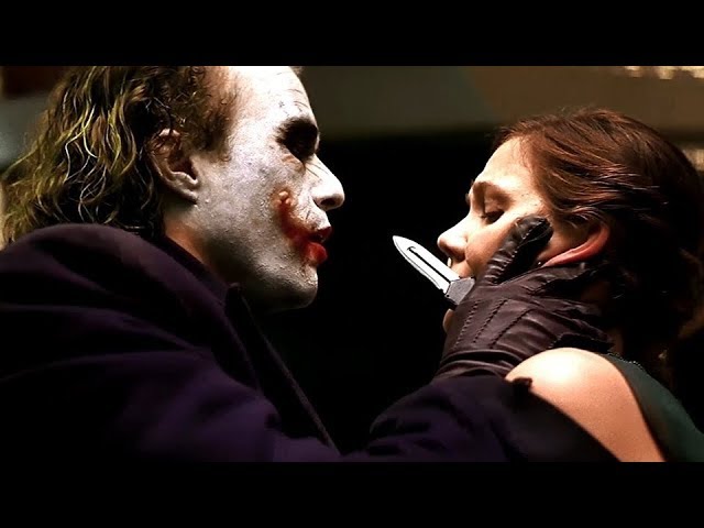 A invasão do Coringa: minutos depois, a porta explode. Escopeta erguida, máscara de palhaço, o caos personificado. Novamente, todas as conversas param. Todos os olhos se voltam para a ameaça. Ele grita perguntando por Harvey, mas ignora completamente os outros convidados e vai direto até Rachel. Tenta pegar um drink de uma bandeja, derruba tudo, também não bebe.