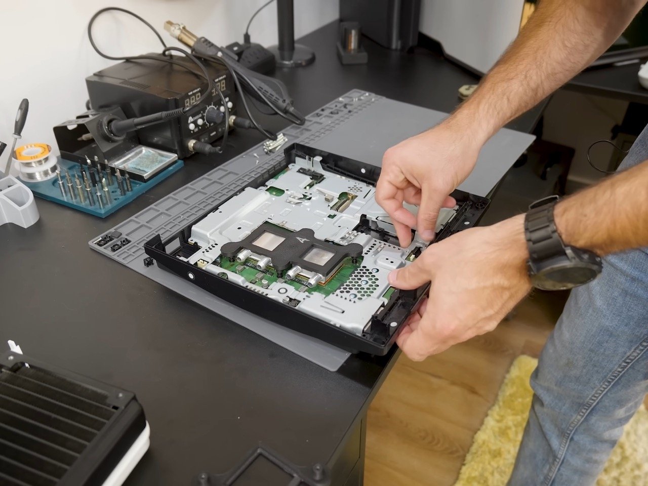 A desmontagem revelou o calcanhar de Aquiles do console. Os dissipadores integrados que cobrem CPU e GPU usam material térmico que resseca com o tempo, transformando o PlayStation em aquecedor. O dissipador da GPU estava literalmente colado, exigindo ar quente e mãos firmes para remover sem destruir o chip. O da CPU tinha um anel de silicone que precisou ser cortado com cuidado milimétrico. Um erro e você tem um peso de papel de 250 dólares.